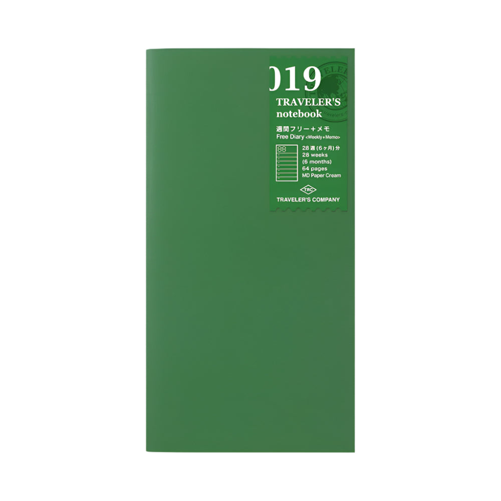 The TRAVELER'S notebook Refill Free Diary Weekly + Grid Notebook 019 offers a weekly planner with a page dedicated to memo space. On one side, there is a designated section for writing plans, while the other side provides gridded pages for effortless writing and sketching.